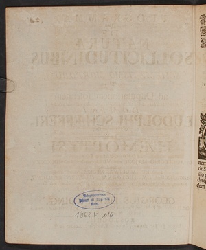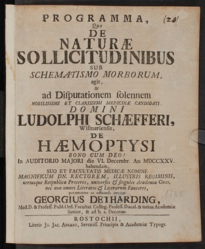 Programma, Quo De Naturæ Sollicitudinibus Sub Schematismo Morborum, agit & ad Disputationem solennem Nobilissimi Et Clarissimi Medicinæ Candidati, Domini Ludolphi Schæfferi, Wismariensis, De Hæmoptysi Bono Cum Deo! In Auditorio Majori die VI. Decembr. Ao. MDCCXXV. habendam, Suo Et Facultatis Medicæ Nomine Magnificum Dn. Rectorem, Illustris Regiminis, utriusque Reipublicæ Proceres, universos & singulos Academiæ Cives, nec non omnes Literatos & Literarum Fautores, peramanter ac officiose invitat Georgius Detharding ... [P.P. Sub sigillo Facultatis Medicæ. Die [] Novembr. Anno MDCCXXV.]
