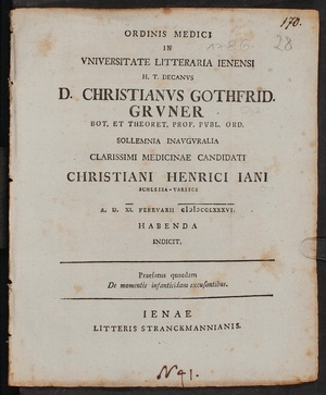 Ordinis Medici In Vniversitate Litteraria Ienensi H.T. Decanvs Christianvs Gothfrid. Grvner Bot. Et Theoret. Prof. Pvbl. Ord. Sollemnia Inavgvralia Clarissimi Medicina̤e Candidati Christiani Henrici Iani Schleiza-Varisci, A. D. 11. Febrvarii MDCCLXXXVI. Habenda Indicit : Praefatus quaedam De momentis infanticidam excusantibus.