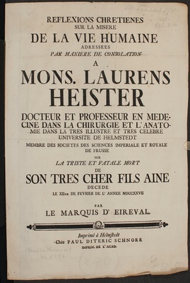 Reflexions Chretienes Sur La Misere De La Vie Humaine : Adressees Par Maniere De Consolation A Mons. Laurens Heister Docteur Et Professeur En Medecine Dans La Chirurgie Et L'Anatomie Dans La Tres Illustre Et Tres Celebre Universite De Helmstedt, Membre Des Societes Des Sciences Imperiale Et Royale De Prusse, Sur La Triste Et Fatale Mort De Son Tres Cher Fils Aine, Decede Le XXIIme De Fevrier De L'Annee MDCCXXVII / Par Le Marquis D' Eireval