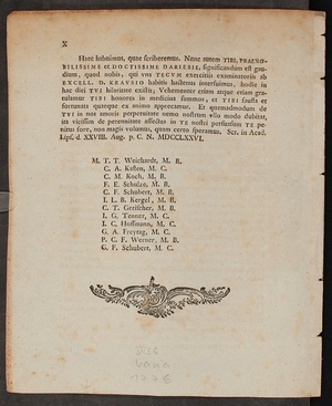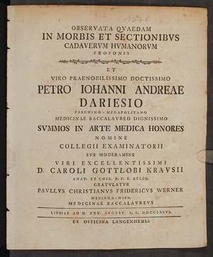 Observata Qvaedam In Morbis Et Sectionibvs Cadavervm Hvmanorvm Proponit Et Viro Praenobilissimo Doctissimo Petro Iohanni Andreae Dariesio, Parchimo- Megapolitano Medicinae Baccalavreo Dignissimo. Svmmos in Arte Medica Honores Nomine Collegii Examinatorii Svb Moderamine Viri Excellentissimi D. Caroli Gottlobi Kravsii, Anat. Et. Chir. P. P. E. Reliq. Gratvlatvr Pavllvs Christianvs Fridericvs Werner, Medinga-Misn. Medicinae Baccalavrevs