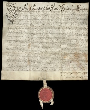 Eb. Franz Ludwig von Neuburg vergibt nach dem Tod seines Vorgängers und des Simplicius Benedikt Erstenberger das Mannlehen zu K.,das dessen Vorfahren von anderen Erzbischöfen und dem Erzstift empfangen hatten,an Jakob Adam Erstenberger. Der erste Lehnsbrief, ausgestellt zu Aschaffenburg am 17.3.1594, ist in der Urkunde inseriert.