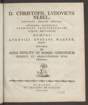D. Christoph. Lvdovicvs Nebel, Facvltatis Medici Decanvs, Sollemnia Inavgvralia Candidati Praenobilissimi Atqve Doctissimi Domini Lvdovici Gvstavi Wagner, Indicit Simulqve De Ae͏̈ris Effectv In Morbis Chirvrgicis Disserit Et Observationes Svas Proponit