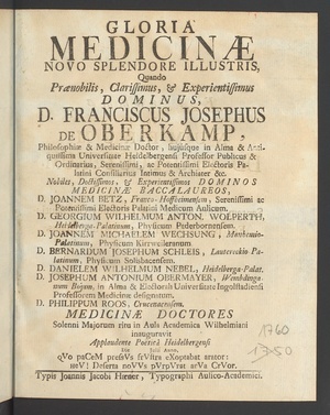 Gloria Medicinæ Novo Splendore Illustris / Quando ... D. Franciscus Josephus de Oberkamp, ... Ordinarius, ... D. Joannem Betz, Franco-Hoffheimensem, ... D. Georgium Wilhelmum Anton Wolperth, Heidelberga-Palatinum, Physicum Paderbornensem. D. Joannem Michaelem Wechsung, Manhemio-Palatinum, Physicum Kirrweileranum, D. Bernardum Josephum Schleis, Lautereckio-Palatinum, Physicum Solisbacensem. D. Danilem Wilhelmum Nebel, Heidelberga-Palat. D. Josephum Antonium Obermayer, Wembdinganum Bojum, in Alma & Electorali Universitate Ingolstadiensi Professorem Medicinæ designatum. D. Philippum Roos, Crucenacensem. Medicinæ Doctores Solenni Majorum ritu in Aula Academica Wilhelmiani inauguravit Applaudente Poëtica Heidelbergensi Die [] Julii Anno, qVo paCeM prefsVs FrVstra eXoptabat arator: HeV ! Deserta noVVs pVrpVrat arVa CrVor.