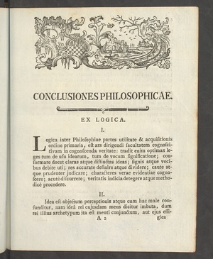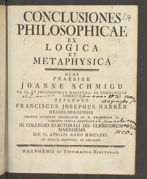 Conclusiones Philosophicae Ex Logica Et Metaphysica / Quas Praeside Joanne Schmigd, AA. LL. Et Philosophiae Magistro, SS. Theologiae Emerito Defendet Franciscus Josephus Harrer, Heidelbergensis, Insignis Ecclesiae Collegiatae Ad S. Swibertum In Caesaris Insula Canonicus In Collegio Electorali DD. Clericorum Mannhemii, Die VI. Aprilis Anno MDCCLXXV. Ab Octava Matutina Ad Decimam.