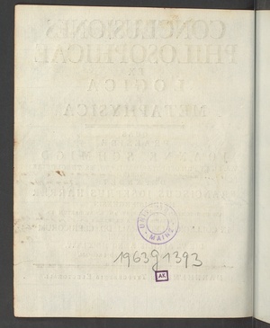 Conclusiones Philosophicae Ex Logica Et Metaphysica / Quas Praeside Joanne Schmigd, AA. LL. Et Philosophiae Magistro, SS. Theologiae Emerito Defendet Franciscus Josephus Harrer, Heidelbergensis, Insignis Ecclesiae Collegiatae Ad S. Swibertum In Caesaris Insula Canonicus In Collegio Electorali DD. Clericorum Mannhemii, Die VI. Aprilis Anno MDCCLXXV. Ab Octava Matutina Ad Decimam.