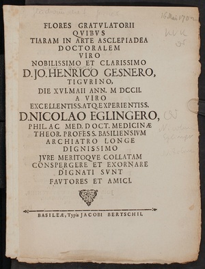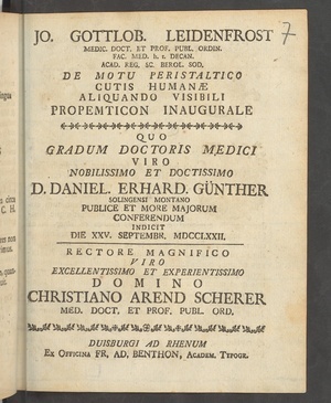 Jo. Gottlob. Leidenfrost, Medic. Doct. Et. Prof. Publ. Ordin. Fac. Med. h. t. Decan. Acad. Reg. Sc. Berol. Sod. De Motu Peristaltico Cutis Humanæ Aliquando Visibili Propemticon Inaugurale Quo Gradum Doctoris Medici Viro Nobilissimo Et Doctissimo D. Daniel Erhard. Günther, Solingensi Montano, Publice Et More Majorum Conferendum Indicit Die XXV. Septembr. MDCCLXXII., Rectore Magnifico Viro Excellentissimo Et Experientissimo Domino Christiano Arend Scherer, Med. Doct. et prof. Publ. Ord.
