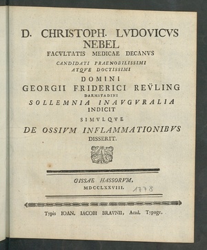 D. Christoph. Lvdovicvs Nebel Facvltatis Medicae Decanvs Candidati Praenobilissimi Atqve Doctissimi Domini Georgii Friderici Rev̈ling Darmstadini Sollemnia Inavgvralia Indicit Simvlqve De Ossivm Inflammationibvs Disserit.