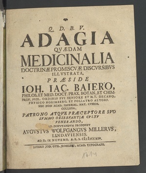 Thesivm Inavgvralivm Pars Mathematico-Physica / Qvam Svb Auspiciis Divinis Rectore Vniversitatis Eberhardino-Carolinae Magnificentissimo, Serenissimo Ac Potentissimo Dvce Et Domino, Domino Carolo Dvce Wirtembergiæ Ac Tecciæ rel. rel. Præside Iohanne Kies, Vniversitatis Et Collegii Illvstris Prof. Phys. Et Matheseos P. O. Regiæ Scientiarvm Academiæ Berolinensis Membro h.t. Pro-Rectore Vnivers. Et Decano Facvlt. Philos., Ad Conseqvendos Legitime Magisterii Philos. Honores Ad diem XIX. Aug. MDCCLXXV. Pvblice Defendent Lavreæ Secvndæ Candidati