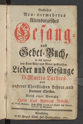 Nachricht. Ein Hochwürdiges Konsistorium allhier hat den Preis des Frankfurtischen Kirchengesangbuchs in diesem kleinen Druck also vestgesetzt: auf Postpapier zu 1 fl. 8 Kr., auf weißem Druckpapier zu 45 Kr., und auf braunem Druckpapier zu 30 Kr.