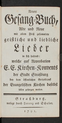 Neues Gesang-Buch, Alte und Neue mit allem Fleiß gesammlete geistliche und liebliche Lieder in sich haltend : welche auf Approbation E. E. Kirchen-Convents und darauf erfolgte Verordnung derer Hoch-verordneten Herren Ober-Kirchen-Pfleger der Stadt Straßburg bey dem öffentlichen Gottesdienst der evangelischen Kirchen daselbst sollen gesungen werden