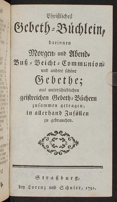 Christliches Gebeth-Büchlein, darinnen Morgen- und Abend-, Buß-, Beicht-, Communion- und andere schöne Gebethe : aus unterschiedlichen geistreichen Gebeth-Büchern zusammen getragen, in allerhand Zufällen zu gebrauchen
