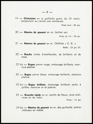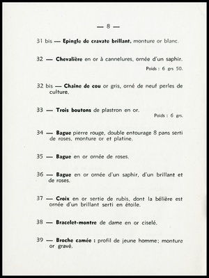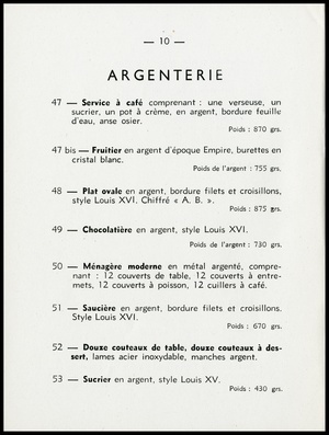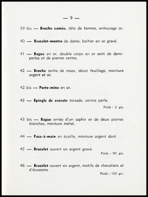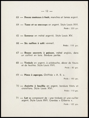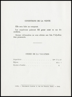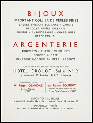 Bijoux : important collier de perles fines, bagues brillant solitaire 3 carats, bracelet rivière de brillants, montre, chronographe, chatelaines, bracelets, etc. : argenterie, couverts, plats, verseuses, service à café, ménagère moderne en métal argenté : dont la vente aux enchères publiques aura lieu Hôtel Drouot, Salle No 9 ,le mercredi 20 janvier 1943 / commissaire-priseur: Roger Glandaz ; expert: Roger Boutemy