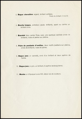 Catalogue des très importants bijoux : bague brillant de 7 carats 87, très beau rang de perles, bague tres̀ important rubis 4 baguettes brillants, bague solitaire de 4 carats 33 etc. : dont la vente aux enchères publiques aura lieu à Paris, Hôtel Drouot, Salle No 7, le vendredi 22 janvier 1943 / par le ministère de Marcel Prud'Homme, commissaire-priseur ; assisté de: Maurice Mellerio