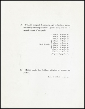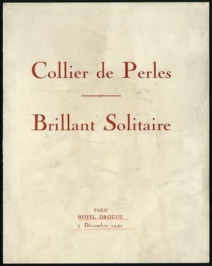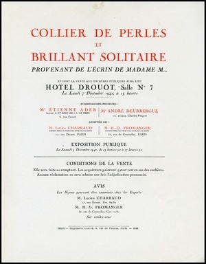 Collier de perles et Brillant solitaire : provenant de l'écrin de Madame M .... : et dont la vente aux enchères publiques aura lieu Hôtel Drouot, Salle No 7, le lundi 7 Décembre 1942 / commissaire-priseur: Étienne Ader, André Deurbergue ; assisté de: Lucien Charraud, H.-D. Fromanger