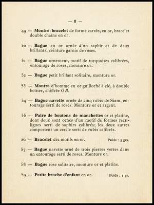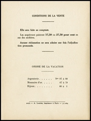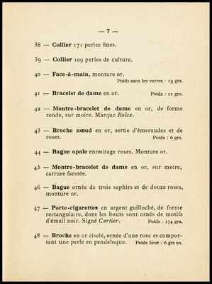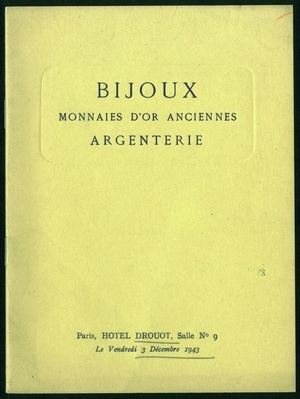 Beaux bijoux : bagues brillants solitaires, boutons d'oreilles brillants, broches brillants, parure, boutons, bague perle et brillants, bracelets or, broche camée, broches or, collier de perles : monnaies d'or anciennes : argenterie, plat d'époque Louis XV : dont la vente aux enchères publiques aura lieu Hôtel Drouot, Salle No 9, le vendredi 3 décembre 1943 / commissaire-priseur: Roger Glandaz, assisté de: Pour les bijoux: Roger Boutemy, pour les monnaies anciennes: Alfred Page