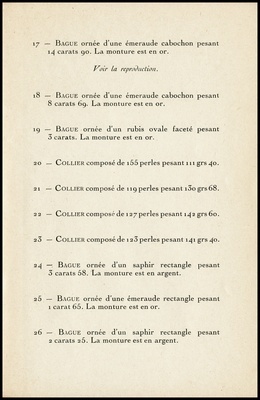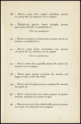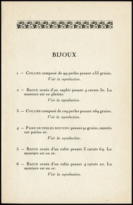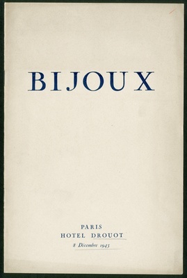 Catalogue des importants bijoux : bagues émeraudes saphir et rubis, perles boutons blanche et noire, rangs de perles fines : dont la vente aux enchères publiques aura lieu Hôtel Drouot, Salle No 10, le mercredi 8 décembre 1943 / commissaire-priseur: Étienne Ader ; assisté de Boucheron