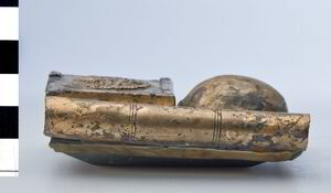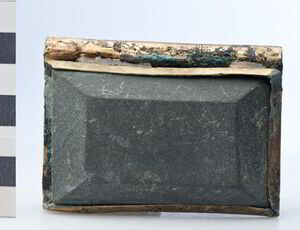 Das Etui für eine Reibpalette besteht aus einer perforierten Platte, an deren Unterseite ein Reibstein eingeschoben ist. Die Hülse diente der Aufbewahrung von Stäbchen und Sonden, die Halbkugel der von Pulver und Pasten. Das Kästchen unter den beiden Götterbildnissen ist verloren. Verschiedene Reibstäbchen oder Spatel dienten dem Zerkleinern und Mischen von Kräutern und Salben auf Paletten.