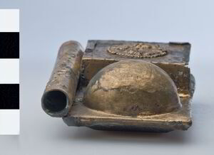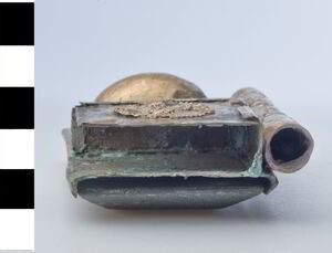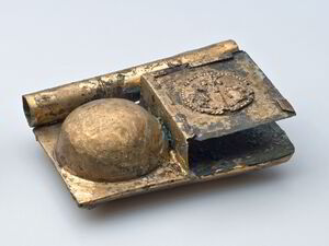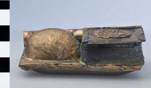 Das Etui für eine Reibpalette besteht aus einer perforierten Platte, an deren Unterseite ein Reibstein eingeschoben ist. Die Hülse diente der Aufbewahrung von Stäbchen und Sonden, die Halbkugel der von Pulver und Pasten. Das Kästchen unter den beiden Götterbildnissen ist verloren. Verschiedene Reibstäbchen oder Spatel dienten dem Zerkleinern und Mischen von Kräutern und Salben auf Paletten.