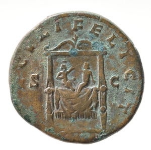 Marc Aurel und seine Gattin Faustina minor feierten jede Geburt ihrer Kinder mit einer neuen Münzprägung. Viele Nachkommen sicherten die Chance auf einen Thronfolger. Das Bildprogramm zeigt die Kaiserin oft als personifizierte Fruchtbarkeit. Nicht alle Münzen lassen sich bestimmten Geburten zuweisen. Sesterz mit Faustina minor und vier Kindern. Umschrift Rückseite: FECVND (itas) AVGVSTAE S(enatus) C(onsulto) „Die Fruchtbarkeit der Augusta – auf Senatsbeschluss geprägt.“ As zur Zwillingsgeburt von Commodus und Aurelius Fulvus Antoninus. Umschrift Rückseite: SAECVLI FELICIT(as) S(enatus) C(onsulto) „Das Glück des Zeitalters – auf Senatsbeschluss geprägt.“ Sesterz mit Faustina zur Geburt des Annius Verus? Umschrift Rückseite: FECVNDITAS S(enatus) C(onsulto) „Fruchtbarkeit – auf Senatsbeschluss geprägt.“