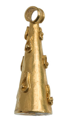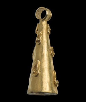 Die kleine goldene Keule ist nicht irgendeine Waffe, sondern die des Heros Herkules, der sich in zwölf spektakulären Taten dem Kampf gegen das Böse stellte, unter anderem mit einer selbstgeschnitzten Keule, die auch sein Markenzeichen ist. Herkules wurde als Alexikakos, auf Griechisch der „Übelabwehrer“, verehrt, und die Keule ist ein Amulett, das hauptsächlich Frauen und Kinder trugen. Die Fertigung aus Gold dürfte die erhoffte Wirkung verstärkt haben, denn dem Material sprach man positive Eigenschaften zu.