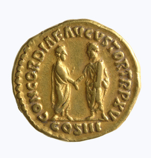 Münzprägungen nach dem Herrschaftsantritt betonen die Eintracht (concordia) der Doppelspitze: Die Kaiser stehen sich auf dieser Goldmünze (aureus) einander im Handschlag gegenüber. Umschrift auf der Reversseite: CONCORDIAE AVGVSTOR(um) TR(ibunicia) P(otestate) XV CO(n)S(ul) III. „Die Eintracht der Kaiser / 15. Tribunizische Gewalt, Konsul zum 3. Mal“. Fundort unbekannt.