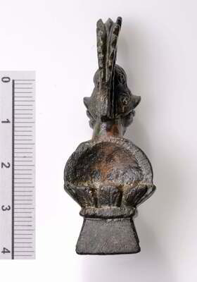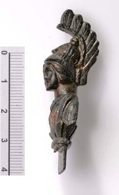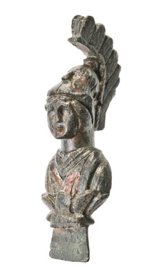 Zum Schreiben verwendete man in der Antike häufig mit Wachs überzogene Holztäfelchen. Mit einem spitzen Griffel, stilus, wurden die Texte darin eingeritzt. Die Oberfläche ließ sich mithilfe eines Wachsspatels, der hier mit der Büste der Göttin Minerva verziert ist, wieder glätten und stand dann für die nächste Mitteilung zur Verfügung.