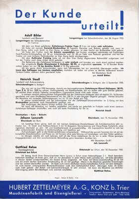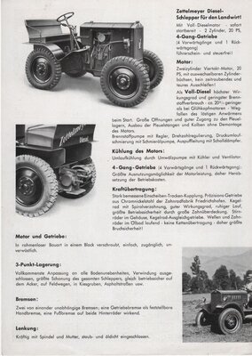 4seitiges Werbeprospekt der Firma Zettelmeyer. Zusammengefaltet handelt es sich um ein Prospekt der Größe DIN A4. Beworben wird der für den landwirtschaftlichen Einsatz konzipierte Dieselschlepper Typ Z I. Auf der Vorderseite befindet sich im Wesentlichen die Fotografie eines im Einsatz befindlichen Traktors mit angehängtem Mähwerk. Die beiden Innenseiten beinhalten einzelne Zeichnungen und Fotografien des Fahrzeuges sowie Zeichnungen mit angebotenem Zubehör. Daneben befinden sich detaillierte Beschreibungen zur Konstruktion, der Technik und den Leistungsmerkmalen. Außerdem sind dort Angaben zu den jeweiligen Preisen enthalten. Auf der Rückseite findet man mehrere Kundenbewertungen bzw. Rückmeldungen aus dem Jahr 1935 zu den jeweils genutzen Fahrzeugen. Die mehrfarbige Broschüre wurde von dem in Trier ansässigen Industriegrafiker Erich Prinz erstellt und in der Druckerei Schaar & Dathe in Trier gedruckt.