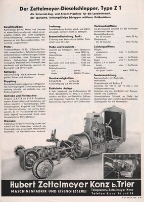 2seitiges, DIN A4 großes Werbeprospekt der Firma Zettelmeyer. Beworben wird der für den landwirtschaftlichen Einsatz konzipierte Diesel-Schlepper Typ Z I. Auf der Vorderseite befinden sich eine farbige Zeichnung des Traktors sowie eine Schwarz-Weiß-Zeichnung, die das Gerät beim pflügen eines Ackers zeigt. Außerdem sind am oberen rechten Rand Schwarz-Weiß-Zeichnungen einer angebauten Seilwinde und eines seitlich angehängten Mähbalkens angebracht. Auf der Rückseite ist eine ausführliche Beschreibung zum Aufbau der Maschine, den technischen Merkmalen und zur angebotenen Sonderausrüstung zu finden. Im unteren Teil dieser Seite ist eine perspektivische Schnittzeichnung mit einer detaillierten Darstellung des Kupplungsgehäuses, dem Getriebe und der Antriebsachse abgedruckt. Eine französische Fassung dieses Prospektes befindet sich ebenfalls im Besitz des Freilichtmuseums. Das Werbeblatt wurde von dem in Trier ansässigen Industriegrafiker Erich Prinz erstellt.