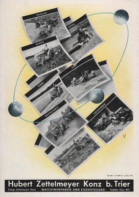 4seitiges Prospekt der Firma Zettelmeyer. Gefaltet besitzt es eine DIN A4-Größe. Beworben wird der für den landwirtschaftlichen Einsatz konziperte Diesel-Schlepper Typ Z I. Auf der ersten Seite ist als farbige Zeichnung ein Traktor beim pflügen eines Ackers abgebildet. Auf den beiden Innenseiten befinden sich mehrere perspektivische Schnittzeichnungen mit detaillierten Darstellungen und Beschreibungen von Bauteilen sowie den Leistungsmerkmalen. Im Übrigen ist dort auch eine Liste der angebotenen Sonderausstattungen abgedruckt. Die Rückseite ist mit mehreren Schwarz-Weiß-Fotografien gestaltet, die eine ganzjährige Einsatzmöglichkeit der landwirtschaftlichen Maschine darstellen möchte. Die Broschüre wurde von dem in Trier ansässigen Industriegrafiker Erich Prinz erstellt und in der Druckerei J. Lintz in Trier gedruckt.