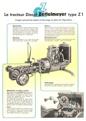 4seitiges Prospekt der Firma Zettelmeyer. Gefaltet hat es eine DIN A4-Größe. Beworben wird in französicher Sprache der für den landwirtschaftlichen Einsatz konzipierte Diesel-Schlepper Typ Z I. Auf der ersten Seite ist als farbige Zeichnung ein Traktor mit einem seitlich angehängten Mähbalken abgebildet. Auf den beiden Innenseiten befinden sich mehrere perspektivische Schnittzeichnungen mit detaillierten Darstellungen und Beschreibungen der Bauteile sowie den Leistungsmerkmalen. Im Übrigen ist dort auch eine Liste der angebotenen Sonderausstattung abgedruckt. Die Rückseite ist mit mehreren Schwarz-Weiß-Fotografien gestaltet, die unterschiedliche Einsatzmöglichkeit der landwirtschaftlichen Maschine darstellen. Die Broschüre wurde von dem in Trier ansässigen Industriegrafiker Erich Prinz erstellt und in der Druckerei Grafische Werkstatt in Trier gedruckt.