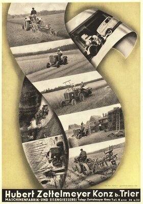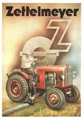 4seitiges Prospekt der Firma Zettelmeyer. Gefaltet hat es eine DIN A4-Größe. Beworben wird in französicher Sprache der für den landwirtschaftlichen Einsatz konzipierte Diesel-Schlepper Typ Z I. Auf der ersten Seite ist als farbige Zeichnung ein Traktor mit einem seitlich angehängten Mähbalken abgebildet. Auf den beiden Innenseiten befinden sich mehrere perspektivische Schnittzeichnungen mit detaillierten Darstellungen und Beschreibungen der Bauteile sowie den Leistungsmerkmalen. Im Übrigen ist dort auch eine Liste der angebotenen Sonderausstattung abgedruckt. Die Rückseite ist mit mehreren Schwarz-Weiß-Fotografien gestaltet, die unterschiedliche Einsatzmöglichkeit der landwirtschaftlichen Maschine darstellen. Die Broschüre wurde von dem in Trier ansässigen Industriegrafiker Erich Prinz erstellt und in der Druckerei Grafische Werkstatt in Trier gedruckt.