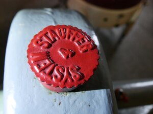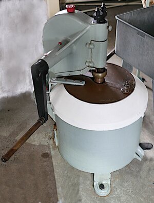 Die schwere Toplader Wäscheschleuder ist für den Handbetrieb mit zwei Personen konzipiert. Hierzu befinden sich 2 große Kurbeln oberhalb der kupfernen und durchlöcherten Schleudertrommel (bzw. ihrer Ummantelung) und treiben diese über eine stabile Mechanik von oben aus an. Die Trommel kann für den Schleudervorgang mit zwei miteinander verschließbaren Kupferplatten abgedeckt werden. Inschrift: System Stauffer 4 Die Staufferbüchse oder Staufferbuchse ist ein Schmierstoffgeber (Fettvorratsbehälter) zur Schmiermittelversorgung von Lagern, welcher beim Nachziehen des mit einem Feingewinde ausgestatteten Deckels mit jeder Drehung frisches Schmierfett durch eine Bohrung an die Lagerstelle drückt. (DIN 3411). Bevorzugtes Schmiermittel ist das Staufferfett. Quelle hierfür: Wikipedia Der Hersteller der Maschine lies sich leider nicht ermitteln