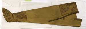 Seidenstoff der Beinlinge Konrads II. aus hellbraunem Doppelköper. Der obere Besatz aus Doppelköper mit Rautenmuster. Die langen Bänder mit einem Tupfenmuster in variiertem Doppelköper. montiert auf neuen Träger. Nur kleine Fragmente erhalten, die im Rahmen der Restaurierung 1960 auf einen Baumwollbatist angeheftet und zum Schutz mit Crepeline überzogen wurden.