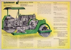 4seitige Werbebroschüre für eine Diesel-Straßenwalze. Diese besitzt im gefalteten Zustand die Größe DIN A4. Auf der Vorderseite des farbig gestalteten Prospektes ist im Wesentlichen die Zeichnung einer im Einsatz befindlichen Straßenwalze abgebildet. Über die beiden Innenseiten verteilt ist eine perspektivische Schnittzeichnung der Baumaschine angebracht, die einen Einblick in den Motor, das Getriebe und die Antriebsachse sowie den jeweiligen Aufbau ermöglicht. Um die Zeichnung herum befinden sich technische und konstruktive Beschreibungen in spanischer Sprache und eine Aufzählung der unterschiedlichen Modelle. Auf der Rückseite der Broschüre wird mittels 6 verschiedener Zeichnungen die Walze bei unterschiedlichen Einsätzen gezeigt. Daneben befindet sich eine tabellarische Auflistung der Maße und Gewichte der Modelle L und M. Die Broschüre wurde von dem in Trier ansässigen Industriegrafiker Erich Prinz erstellt.