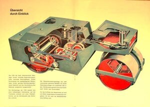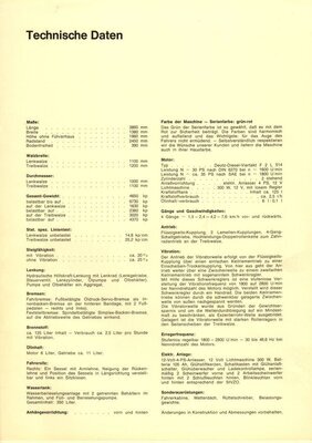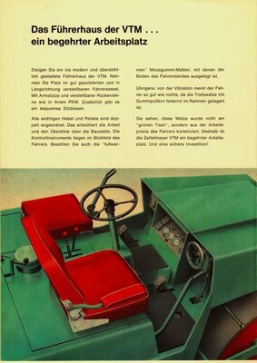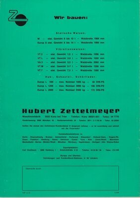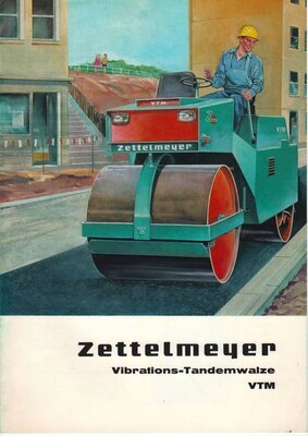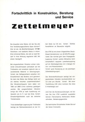 8seitiges, DIN A4 großes Werbeprospekt. Auf der Vorderseite ist die Zeichnung einer im Arbeitseinsatz befindlichen Tandemwalze abgebildet. Eine Tandemwalze besitzt zwei Walzenkörper. Sie wird zur Verdichtung von Bodenmaterial eingesetzt. Auf den Seiten 2 und 3 des Prospektes sind Beschreibungen der Baumaschine und die Leistungsmerkmale abgedruckt. Daneben wird mit drei Zeichnungen die Walze in einer Vorder-, Seiten- und Rückansicht gezeigt. Auf den mittleren Seiten 4 und 5 ermöglicht eine perspektivische Schnittzeichnung einen Einblick in die Konstruktion der einzelnen Bauteile. Die Vorteile der Bauweise wird daneben textlich beschrieben. Die übrigen Seiten bilden Beschreibungen des Fahrerbereichs, die technischen und baulichen Kennzahlen -wie Maße, Gewicht, Verbrauch- sowie der angebotene Sonderausrüstung ab. Außerdem wird auf die restliche Produktpalette der Firma Zettelmeyer sowie das kundendienstliche Netz hingewiesen. Die Broschüre wurde von dem in Trier ansässigen Industriegrafiker Erich Prinz erstellt.