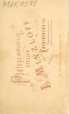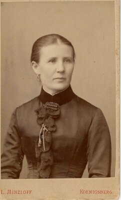 Die Aufnahme zeigt eine Frau mittleren Alters mit einer sehr schmalen Taille (Wespentaille). Sie trägt ein enganliegendes dunkles Oberteil mit langen Ärmeln und hohem Stehkragen mit kleiner weißer Spitze. Mit einer länglichen Brosche ist ein Jabot am Kragen befestigt, desweiteren trägt sie Creolen. Ihre glatten Haare sind in der Mitte gescheitelt und streng nach hinten frisiert. Den Kopf leicht nach links gedreht, schaut sie an der Kamera vorbei. Die Aufnahme entstand im Photoatelier L. Minzloff in Koenigsberg. Auf der Rückseite befindet sich Werbung des Ateliers.