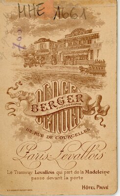 Das Foto in Vignettenart zeigt eine junge Frau, die direkt und freundlich in die Kamera blickt. Sie trägt vermutlich ein dunkles Kleid, von dem man nur das Oberteil sieht. Dieses ist eng anliegend und mit Querfalten u. -Rüschen besetzt. Die Schultern sind leicht erhöht und betont, der Kragen hoch geschlossen und mit Spitze versehen. Vom Kragen bis zur schmalen Taille ziert eine leichte -vermutlich goldene Kette- das Oberteil. Die Haare der Dame sind über Stirn , Seiten und Nacken auf dem Oberkopf toupiert und zu einem Chignon frisiert. Auf der Rückseite erkennt man das Emblem des Fotografen oder Fotostudio Berger aus Paris-Levallois