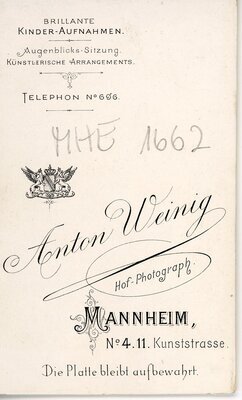 Die Studioaufnahme vor einer Art Fototapete zeigt eine junge Frau, die, mit einem kleinen Kind auf dem Schoß sitzend, links an der Kamera vorbeischaut. Sie trägt ein zweiteiliges und zweifarbiges Kostüm. Das helle enge Oberteil hat Keulen- oder auch Schinkenärmel, ist hoch geschlossen und bis zur Brust mit Längsrüschen versehen. Hingegen ist der dunkle Rock vorne glatt und weit fallend, hinten mit Plissee versehen. Das Kleinkind trägt ein samtschimmerndes Kleidchen, ebenfalls mit Keulenärmeln und großem eckigem , mit Borten und Spitzen besetztem Kragen. Auf der Rückseite des Fotos ist das Emblem des Hof-Photographen Anton Weinig.