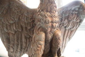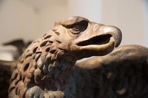 Linke Adlerskulptur eines Adlerpaares, deren Kopfhaltung und Blickrichtung einander zugewand sind. Linkes Bein ist vorgestreckt. Die Adler bekrönten Sockel rechts und links des Eingangsportals zum Gelände der Sayner Hütte. Die original preußischen Adler-Skulpturen wurden im Sommer 2010 von ihrem ursprünglichen Aufstellungsplatz abgenommen, restauriert, abgeformt und Nachgüsse angefertigt. Die Nachgüsse wurden auf den restaurierten Sockeln am Eingangsportal des Denkmalareals Sayner Hütte wieder aufgestellt, während die Original-Adler in der Dauerausstellung des Rheinischen Eisenkunstguss-Museums ihren Platz fanden.