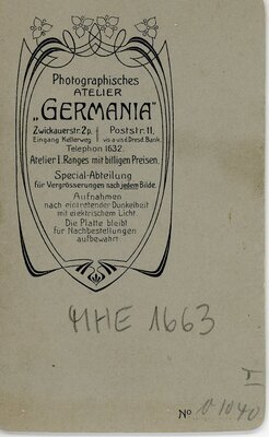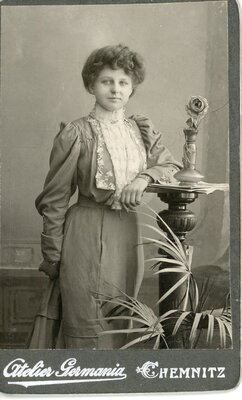 Die Studioaufnahme zeigt eine junge Dame, die mit dem linken Arm aufgelehnt an einer hohen Blumensäule steht und links an der Kamera vorbeischaut. Auf der Blumensäule steht eine kleine Blumenvase mit einer Rose. Die junge Frau trägt ein 2-teiliges Kostüm, oder auch Straßenkleid, das Oberteil eine Art Jackenteil-Figarojäckchen mit aufgebauschten Ärmeln. Das mit Blumenspitzen verzierte breite Revers ist vorne vom Hals bis zur Gürtellinie offen. Darunter eine helle, mit kleinen Rüschen und Stehkragen besetzte Bluse. Der Rock fällt vorne glatt und gerade, hinten jedoch mit einer in kleinen Volants gelegten Schleppe, die mit der rechten Hand der jungen Frau festgehalten wird. Ihre Haare sind bauschig um den ganzen Kopf auftoupiert und vermutlich hinten zusammen gesteckt. Auf der Rückseite des Fotos ist das Logo des Ateliers Germania aus Chemnitz