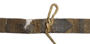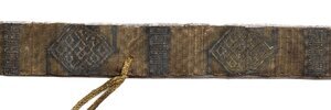 Gefunden im Grab König Philipps von Schwaben anlässlich der Öffnung der Kaisergräber im Jahr 1900. Festes Gewebeband aus Seide und Metallfäden mit angehängten Schnüren. Der Gürtel ist in einer Breite von 2,2 cm als Brettchengewebe mit 61 Brettchen, bezogen mit seidenen Kettfäden, gefertigt und auf zweierlei Weise gemustert. Hergestellt vermutlich in Südeuropa (Spanien?). Das Grundgewebe ist alternierend in Felder mit Schachbrett- und Streifenmuster eingeteilt. Die gestreiften Abschnitte dienen als Grundfläche zur weiteren Musterung mit Metallfäden in der Soumaktechnik und Broschierung. An Motiven treten Winkelhaken, Hakenkreuze, Rauten, Ranken und Tiermotive auf. In das Gürtelband sind vier Schnüre eingehängt, von denen eine vermutlich zum Schließen des Gürtels gedient hat. Ob die drei weiteren zur Befestigung der Beinlinge am Gürtel dienten, lässt sich heute nicht mehr mit Bestimmtheit sagen.