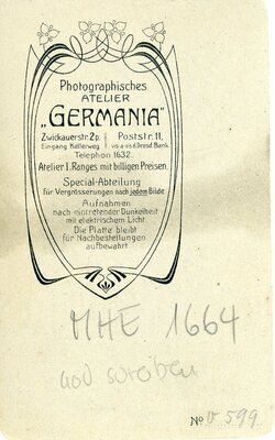 Die Aufnahme zeigt eine junge Frau, die in einem Studio steht und direkt in die Kamera schaut. Sie steht vor einem dunklem Vorhang, links neben ihr ein Hochstuhl. Sie trägt ein helles Kleid mit breitem Taillengürtel. Der Rock ist ist aus glattem Stoff, der an den Seiten in Längsfalten gelegt ist. Das Oberteil ist über der Brust und an den langen weiten Manschettenärmeln mit Rüschen und Spitze besetzt. Den kleinen Stehkragen ziert eine kleine Brosche. In der rechten Hand, dessen Gelenk ein Armband ziert, hält die junge Dame die Schleppe des Rockes seitlich fest, während sie in der linken Hand 2 helle Blumen, vermutlich Rosen, hält. Ihre dunklen Haare sind hochtoupiert und auf dem Oberkopf zusammen gesteckt. Auf der Rückseite des Fotos erkennt man das Emblem des Ateliers Germania aus Chemnitz