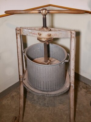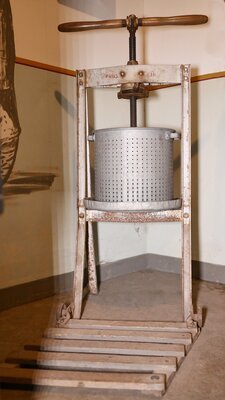Mechanische Wäschepresse. Bei diesem Modell wird der Presskorb von oben mit der nassen Wäsche befüllt und mit einem Holzdeckel, dem Pressstempel verschlossen. Durch Drehung der Spindel wird dann die Wäsche trocken gepresst. Das Wasser läuft an der Vorderseite ab und kann in einem Eimer gesammelt werden. Zur Stabilisierung des Geräts beim Pressvorgang dient das Holzgitter, auf das man sich beim Drehen der Spindel stellt. Das Gerät ist mittelgut erhalten. Wäschepressen dieser und ähnlicher Bauart wurden in den 1930er Jahren entwickelt und kamen bin in die 1960er Jahre zum Einsatz. Danach wurden sie endgültig durch die effektivere Wäscheschleudern verdrängt. Inschriften: Vorne: Vorderseite: AUS EIN Rückseite: ...