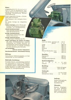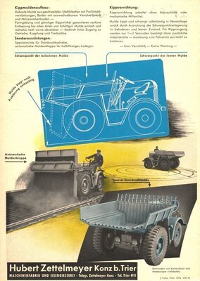 4seitig, farbig gestaltete Werbebroschüre für den Autoschütter Typ A 2 mit einer Motorstärke von 30 PS. Die Bezeichnung Autoschütter beschreibt ein Baustellenfahrzeug mit einer kippbaren Mulde zum Transport von Baumaterial. Alternativ werden hierfür auch die Begriffe Vorderkipper oder Dumper verwendet. Es handelt sich um ein Fahrzeug mit einer kompakten Bauart. In dem farbig gestalteten, DIN A 4-großen Faltblatt befindet sich auf der Vorderseite die Zeichnung einer größeren Baustelle mit mehreren im Einsatz befindlichen Baumaschinen. In den beiden Innenseiten sind zum einen die einzelnen Bauteile des Autoschüters Typ A 2 beschrieben und mit farbigen Zeichnungen dargestellt. Zum anderen werden die Leistungsmerkmale und Maße der Baumaschine aufgeführt. Die Rückseite enthält mehrere Zeichnungen und eine Beschreibung des Aufbaus sowie der Funktionsweise der Muldenkippung. Im Übrigen wird auf die angebotene Sonderausrüstung einer Spezialmulde für Steinbruchbetriebe und einer automatischen Muldenklappe für halbflüssiges Ladegut hingewiesen. Die Broschüre wurde von dem in Trier ansässigen Industriegrafiker Erich Prinz erstellt in der Trierer Druckerrei J. Lintz gedruckt.