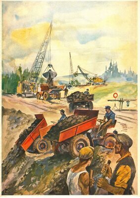 4seitig, farbig gestaltete Werbebroschüre für den Autoschütter Typ A 2 mit einer Motorstärke von 30 PS. Die Bezeichnung Autoschütter beschreibt ein Baustellenfahrzeug mit einer kippbaren Mulde zum Transport von Baumaterial. Alternativ werden hierfür auch die Begriffe Vorderkipper oder Dumper verwendet. Es handelt sich um ein Fahrzeug mit einer kompakten Bauart. In dem farbig gestalteten, DIN A 4-großen Faltblatt befindet sich auf der Vorderseite die Zeichnung einer größeren Baustelle mit mehreren im Einsatz befindlichen Baumaschinen. In den beiden Innenseiten sind zum einen die einzelnen Bauteile des Autoschüters Typ A 2 beschrieben und mit farbigen Zeichnungen dargestellt. Zum anderen werden die Leistungsmerkmale und Maße der Baumaschine aufgeführt. Die Rückseite enthält mehrere Zeichnungen und eine Beschreibung des Aufbaus sowie der Funktionsweise der Muldenkippung. Im Übrigen wird auf die angebotene Sonderausrüstung einer Spezialmulde für Steinbruchbetriebe und einer automatischen Muldenklappe für halbflüssiges Ladegut hingewiesen. Die Broschüre wurde von dem in Trier ansässigen Industriegrafiker Erich Prinz erstellt in der Trierer Druckerrei J. Lintz gedruckt.