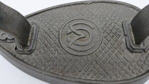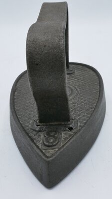 Das vorliegende Bügeleisen ist aus Gusseisen und besitzt einen angeschweißten Bügel. Die Oberfläche ist mit schräg laufenden Quadraten verziert. Zudem ist in der Mitte eine Gussmarke mit den kunstvoll verschlungenen Buchstaben M und U, wahrscheinlich den Initialen des Herstellers. An der Spitze befindet sich die Ziffer 8. Das Bügeleisen gehörte ursprünglich wohl zu einem Satz von Bügeleisen. Bügeleisen werden seit dem 17. Jahrhundert zum Glätten der Wäsche verwendet. Die ersten Bügeleisen bestanden aus einer Metallplatte und einem bügelartigen Griff. Daher auch der Name. Flacheisen wurden in Privathaushalten auf der Herdplatte, in gewerblichen Betrieben auch auf speziellen Bügeleisenöfen erhitzt und konnte dann so lange es heiß war zum Glätten der vorher mit Wasser eingesprengten Wäsche verwendet werden. Wurde das Eisen auf oder in einem Kohleofen erhitzt, musste es zuerst von Kohleresten gereinigt werden. War das Eisen zu sehr abgekühlt, musste es gegen ein gerade aufgeheiztes Exemplar ausgetauscht werden. D.h. zum kontinuierlichen Bügeln waren mehrere Bügeleisen vonnöten.