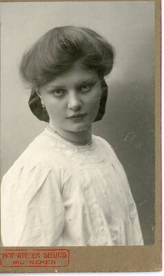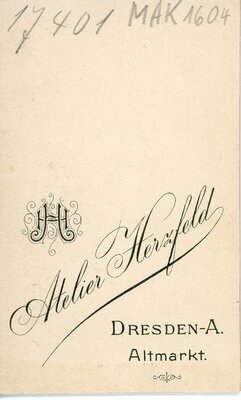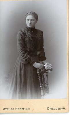Das Foto entstand in einem Fotostudio vor einem hellen Hintergrund mit dezenter Bemalung. Das junge Mädchen steht hinter einem Stuhl mit einer aufwendig gedrechselten Rückenlehne. Ihre Hände in denen sie ein kleines Blumensträußchen hält liegen leicht auf der Rückenlehne auf. Es trägt ein wsl. bodenlanges dunkles Kleid mit Streifen und langen Ärmeln, einem Schulterkragen sowie darunter einem hohen Stehkragen. Die Haare sind in der mitte gescheitelt und als Flechtfrisur am Oberkopf befestigt. Leicht nach rechts gedreht schaut das Mädchen an der Kamera vorbei. Die Aufnahme entstand im Atelier Herzfeld in Dresden-Anhalt. Auf der Rückseite befindet sich Eigenwerbung des Ateliers.