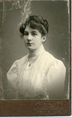 Die Aufnahme entstand in einem Fotostudio vor einem dunklen Hintergrund und zeigt eine junge Frau die eine helle Bluse trägt. Die Bluse hat Puffärmel und einen hohen Stehkragen mit Spitzenbesatz. Im Brustbereich erkennt man Längsbiesen und dazwischen einen Spitzenbesatz. Die Frau trägt eine Halskette mit Anhänger und Creolen.Die Haare sind am Oberkopf zusammen gesteckt. Leicht nach rechts gedreht schaut sie in die Kamera. Das Foto enstand im Atelier Klinger; Inhaber: German Gober in Braunau am Inn. Auf der Rückseite befindet sich Eigenwerbung des Ateliers und der Hinweis auf Nachbestellungen.Ebenso ein Hinweis auf "Höchste Auszeichnung seiner Majestät Kaiser Franz Josef I. von Österreich, Königl. Hoheit Prinz Ludwig von Bayern"