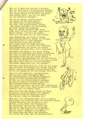 36seitige Festschrift, die zum 21.02.1936 in einer geheftetet DIN A4 Größe erstellt worden ist. Es handelt sich mutmaßlich um ein Heft, das anlässlich einer Firmenfeier während der Fastnachtszeit verfasst wurde. Darin werden zum Teil in Reimform Beschäftigte des Unternehmens hinsichtlich ihrer Funktion und Arbeitsweise in amüsanter Form beschrieben. Außerdem beinhaltet das Heft eigens auf die Gegebenheiten der Firma Zettelmeyer umgeschriebene Lieder. Comiczeichnungen und Texte beschreiben im Übrigen die Entwicklung des Unternehmens. Die einzelnen Seiten der farbig gestalteten Festschrift sind durch passende Skizzen reichlich bebildert. Sie wurde durch den Trierer Industriegrafiker Erich Prinz erstellt.