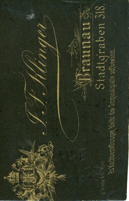 Die Vignettenaufnahme zeigt ein junges Mädchen welches links an der Kamera vorbeischaut. Die wohl helleren Haare sind komplett nach hinten gesteckt. Man sieht die Oberbekleidung nur bis unter den Brustansatz. Womöglich handelt es sich um eine eng anliegende Bluse oder das Oberteil eines Kleides. Dieses zieren auf der linken Seite 2 Längsstreifen oder -Bänder , eventuell aus Samt oder ähnlichem Gewebe. Der kleine Stehkragen ist aus heller Spitze und die Ärmel sind als ganz leichte Puffärmel angedeutet. Sie trägt kleine Ohranhänger und eine kurze Perlenkette. Auf der Rückseite des Fotos ist das Emblem des Fotoateliers J.F. Klinger aus Braunau, mit Hinweis auf Nachbestellungen, abgebildet